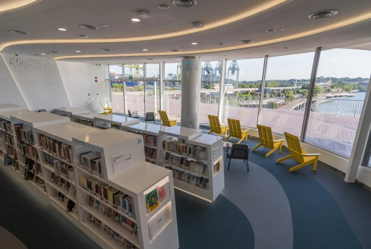 Adults' and Teens' Zone: This space is dedicated to adult readers and young adults. Providing a quiet and conducive environment for study and reading. It features cozy reading lounges for teens with large windows and comfortable yellow deck chairs, where visitors can enjoy breathtaking views of Sentosa and the sea.