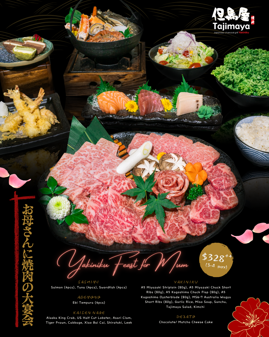Show your appreciation to your mum with premium quality dishes like our Kaisen Nabe Mini Hotpot (including Alaska King Crab, US Half Cut Lobster, Asari Clams and more), a Yakiniku feast (including cuts like A5 Miyazaki Striploin, A5 Kagoshima Oysterblade, and more), and complete with fresh Sashimi, Ebi Tempura, and dessert.